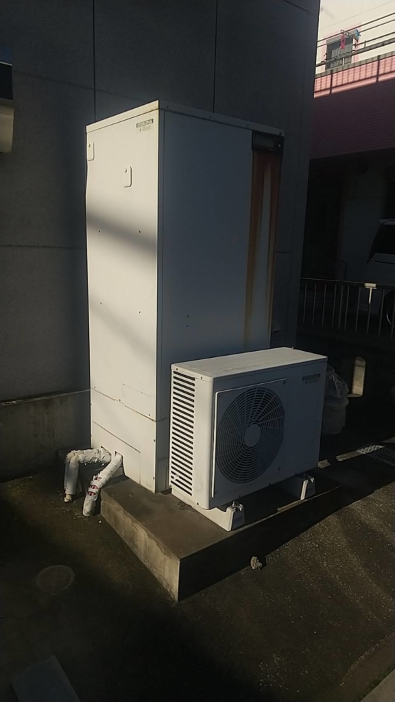 既設のエコキュートが多機能エコキュートという暖房機能がついたタイプが設置されており、今回は通常のエコキュートへ交換・エコ暖房はお客様ご自身で別に設置する事になりました。