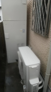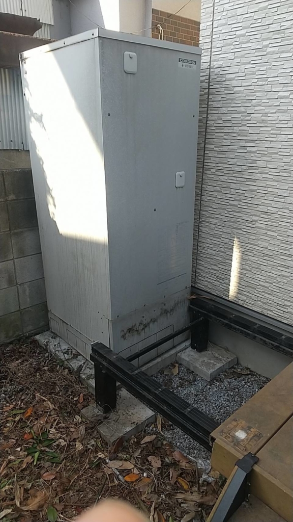 エコキュート交換する際に本体の正面がウッドデッキ側を向いてしまうとメンテナンス作業が行えない為、90°向きを変えて設置し、ウッドデッキを元に戻しても問題がないようにさせていただきました。